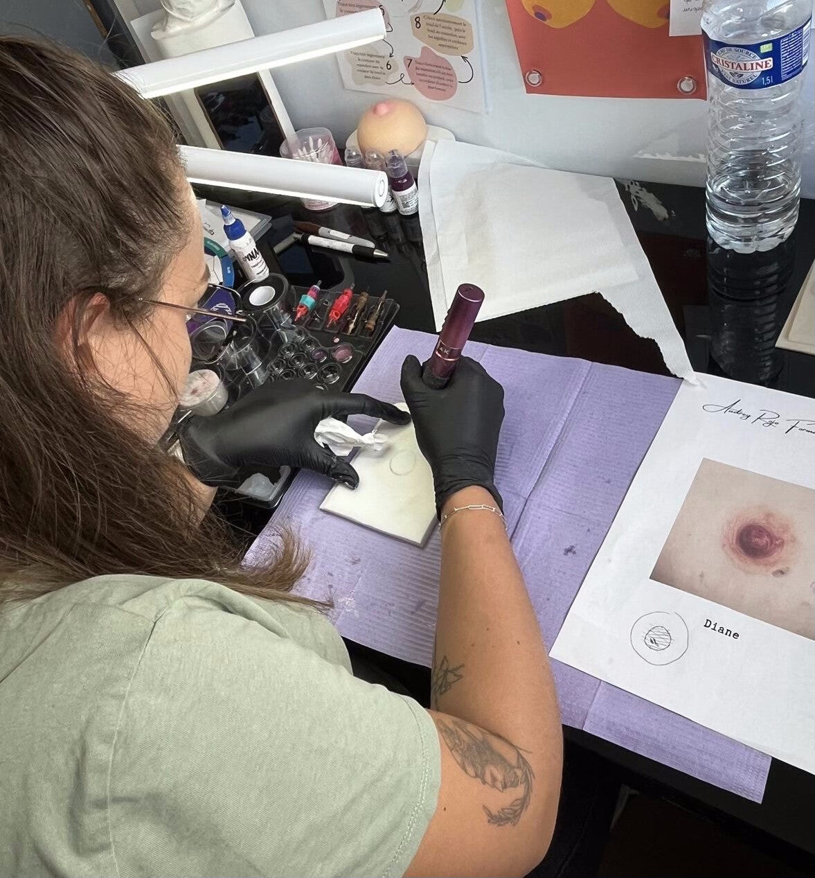 J’utilise cette technique pour pouvoir recréer des mamelons en 3D avec effet trompe l’œil pour toutes les femmes qui ont subit une chirurgie mammaire, que ce soit de la création complète à l’harmonisation des couleurs du mamelon.